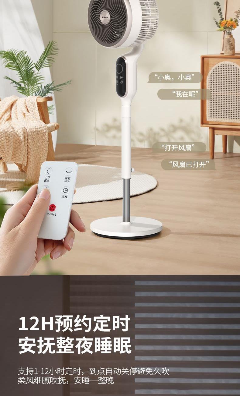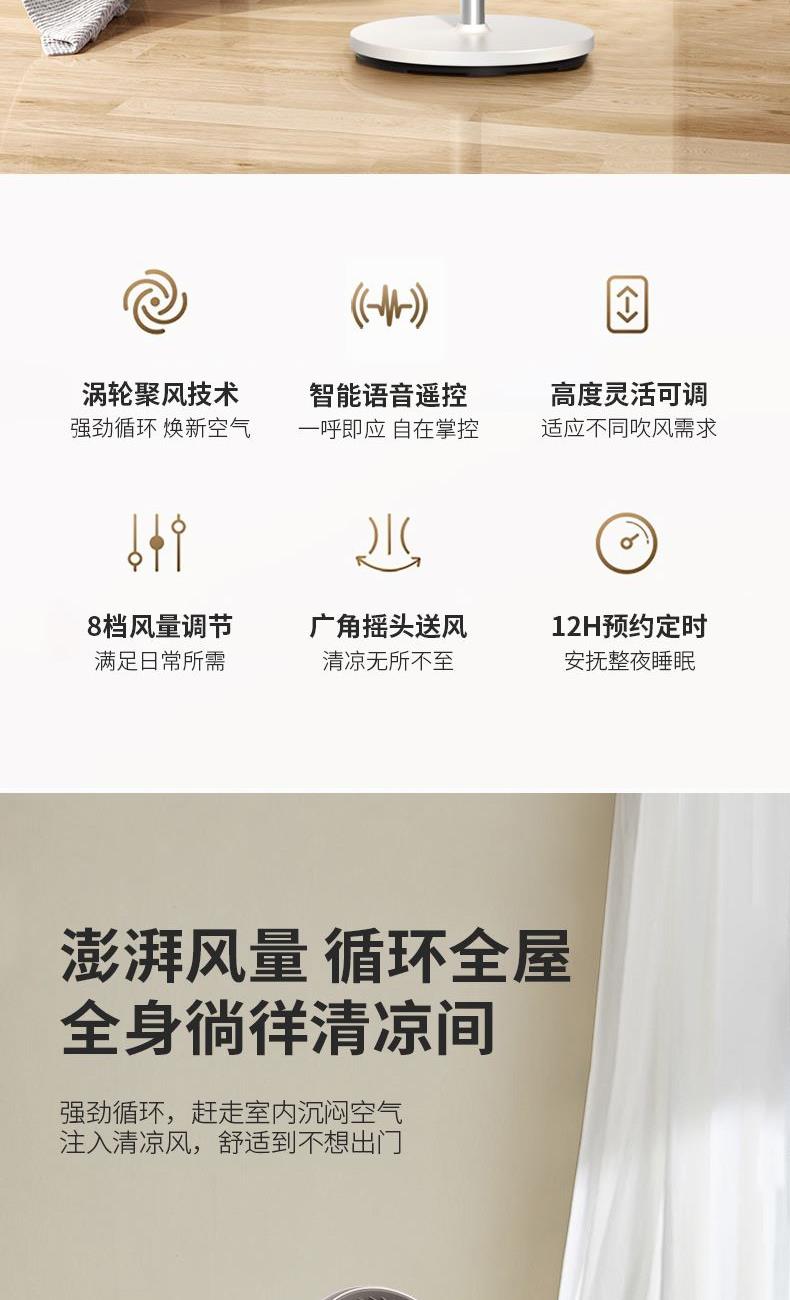 额定电压:220V~ 额定功率:40W 额定频率:50Hz 电源线长:150cm 材 质:前网、后网、风叶、底座:PP,立柱管:ABS、铁 > 智能语音操作,遥控器操作,无需走动,解放双腿 > 8档风速调节,满足全家使用 > 12h智能定时,到点即停,不怕着凉 > 高度随心可调,上下左右自动摇头 > 贴心设计香薰盒,可放置防 蚊虫香薰,驱赶蚊虫
